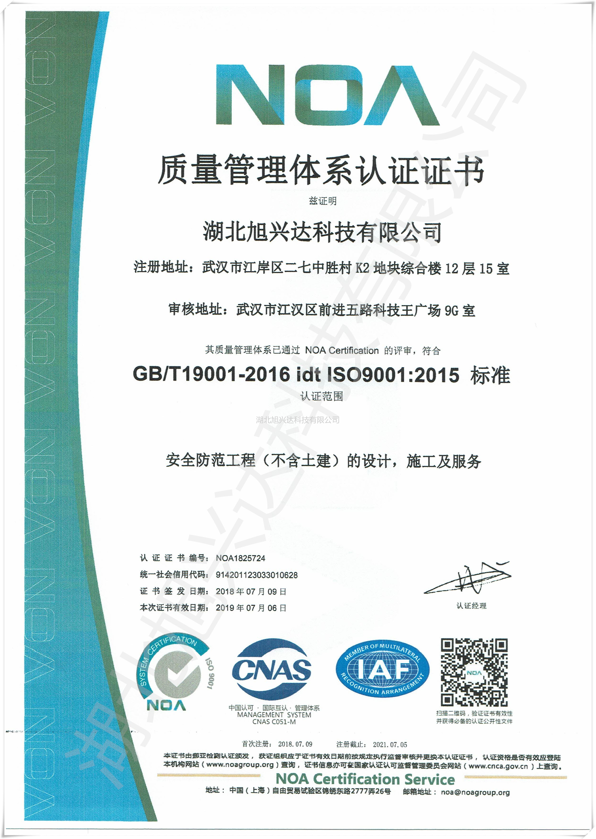 在2018年07月09日,湖北旭兴达T19001科技有限公司 其质量管理体系已通过 NOA Certification的评审,符合GB/T19001-2016 idt ISO9001:2015标准。认证范围:安全防范工程(不含土建)的设计,施工及服务