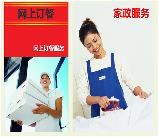 家政服务,保洁服务,会所预订,订餐服务,网上超市购物。