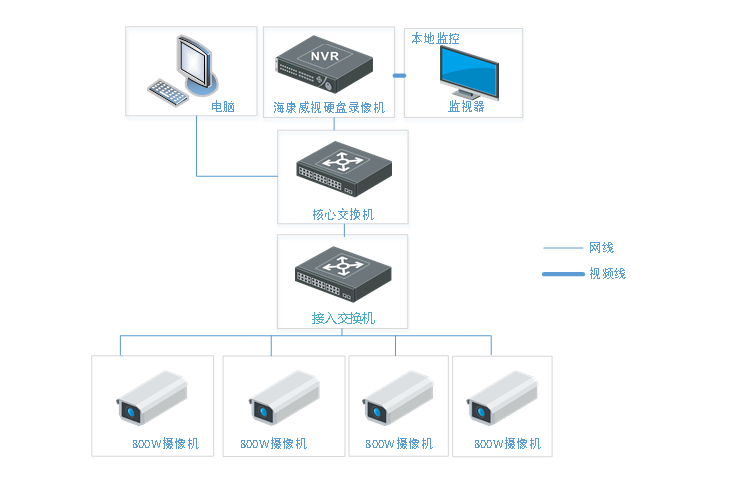方案通过海康威视800W星光摄像机来实现图像的高清及远距离采集,通过交换机,将信号稳定传至后端录像机,实现监控预览、存储、回查等其他功能。