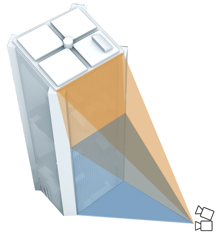 在住宅楼层高达100米时,需采用两个摄像机上下组合正对住宅楼,中间楼层建议重叠监控,实际安装如下图所示: