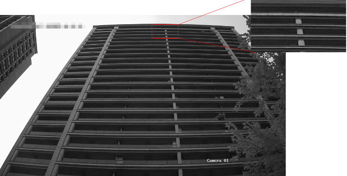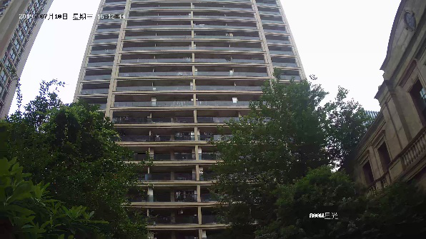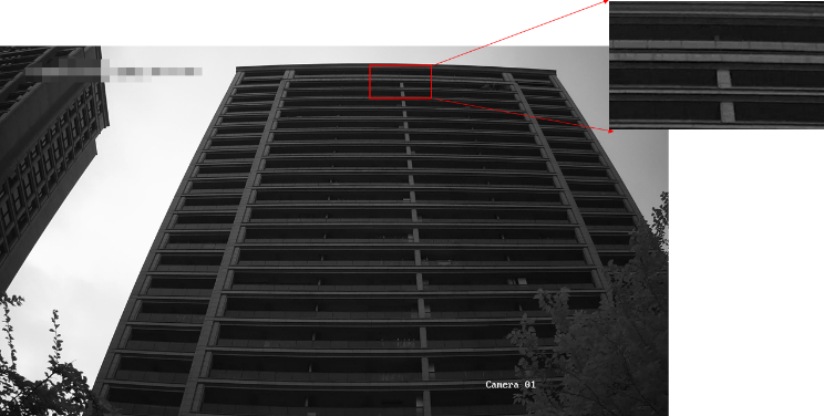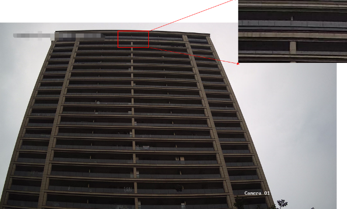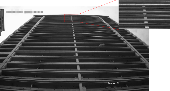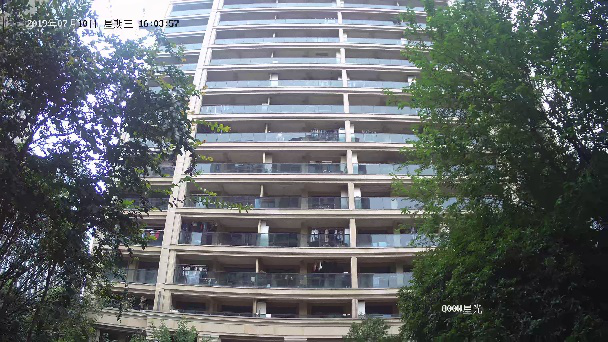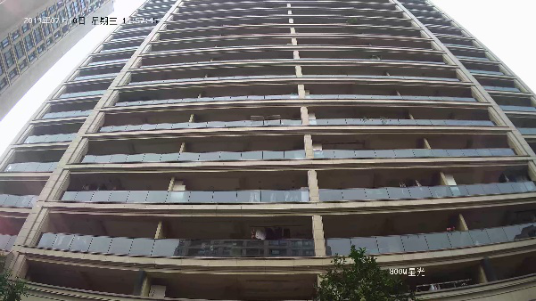住宅楼层高3.1米,总共30层,楼高约100米,采用超高清星光800W摄像机(6mm)和超高清星光800W摄像机(4mm)上下组合监控。